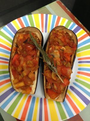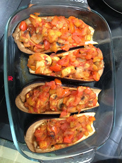 Una vez ya esta listo el relleno, retiramos las berenjenas del horno, las rellenamos y las volvemos a decar en el horno entre 10 o 15 min, dependiendo del tamaño de las berenjenas, para que se terminen de coinar.