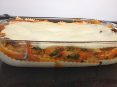 En una fuente para horno, vamos colocando las placas de lasaña, incorporamos las verduras y otra capa de lasaña, mas verduras y finalizamos con placas de lasaña.