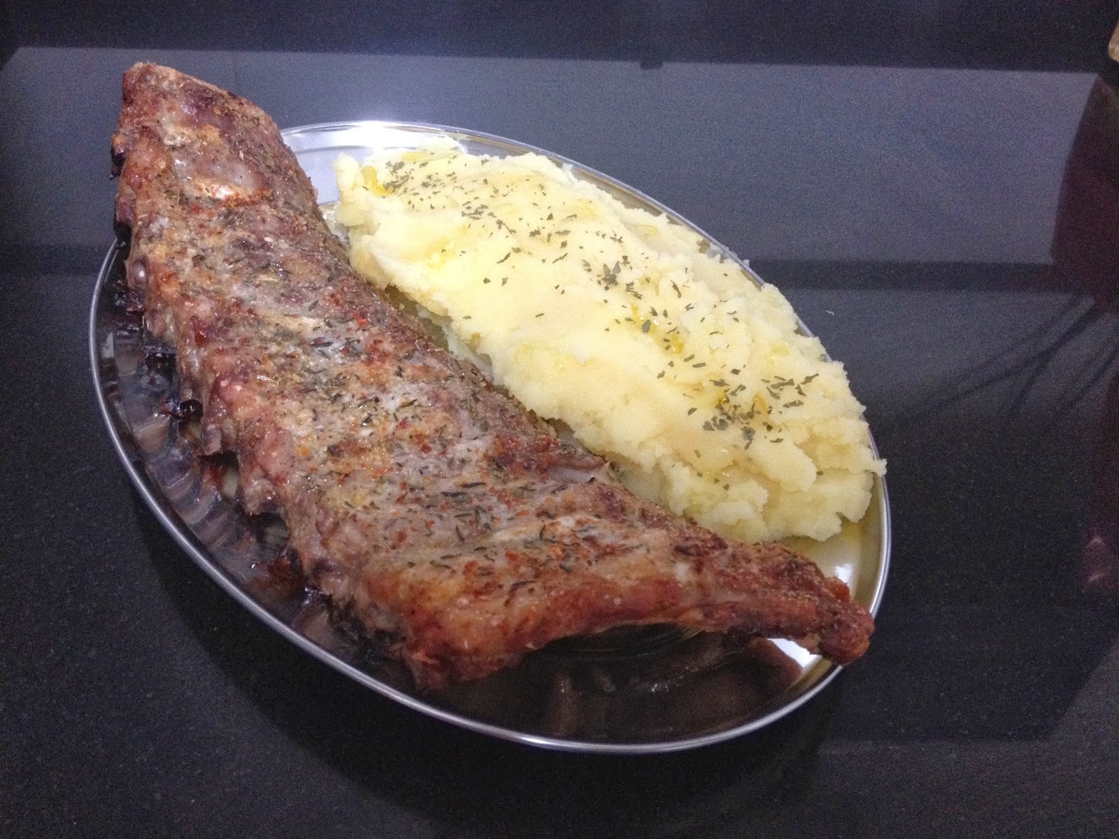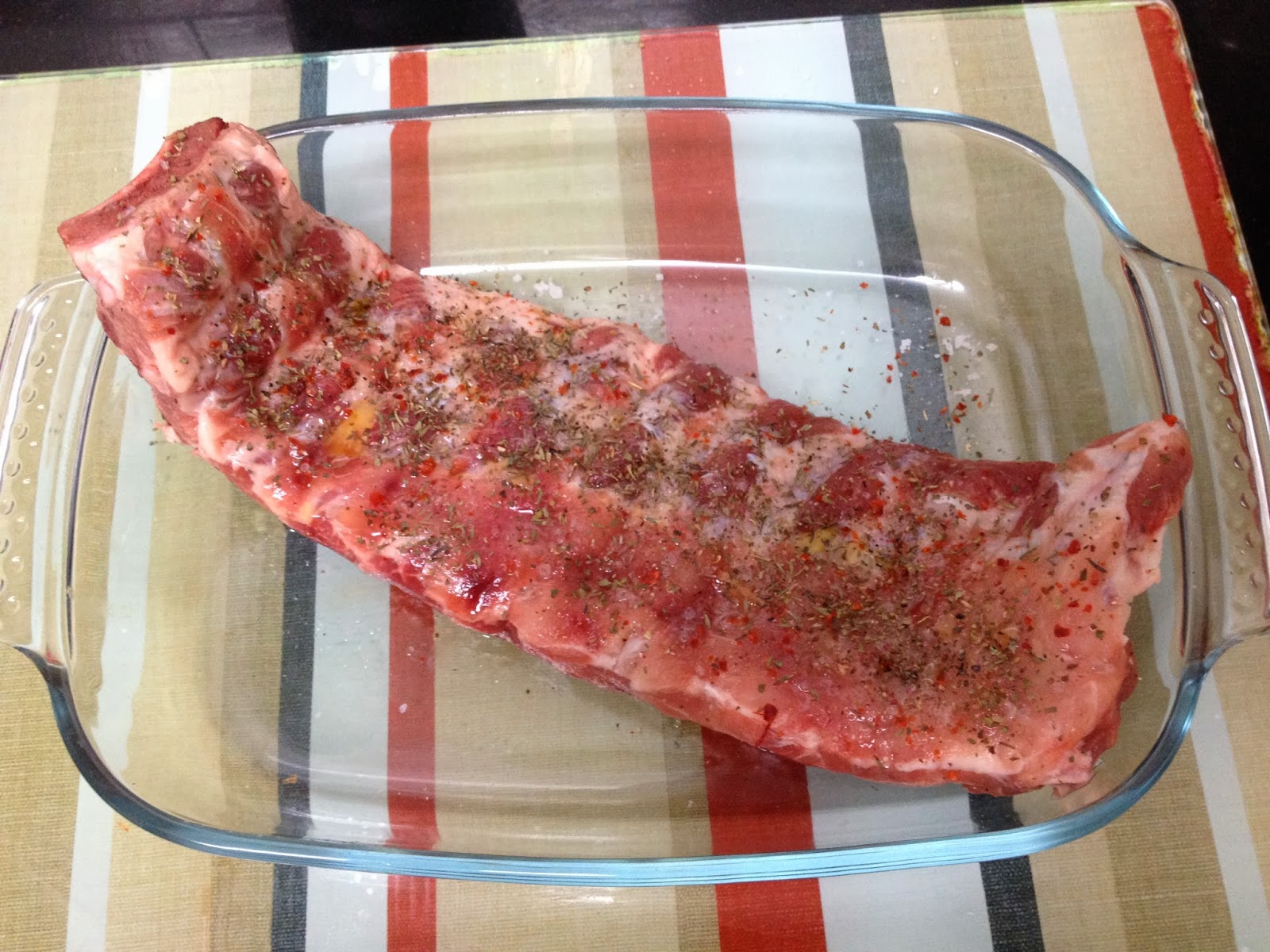 En una bandeja de horno colocamos las costillas y las sazonamos, incorporamos la pimienta, tomillo , chíle e introducimos en el horno durante 35 min aproximadamente, dependiendo del tamaño de las costillas.