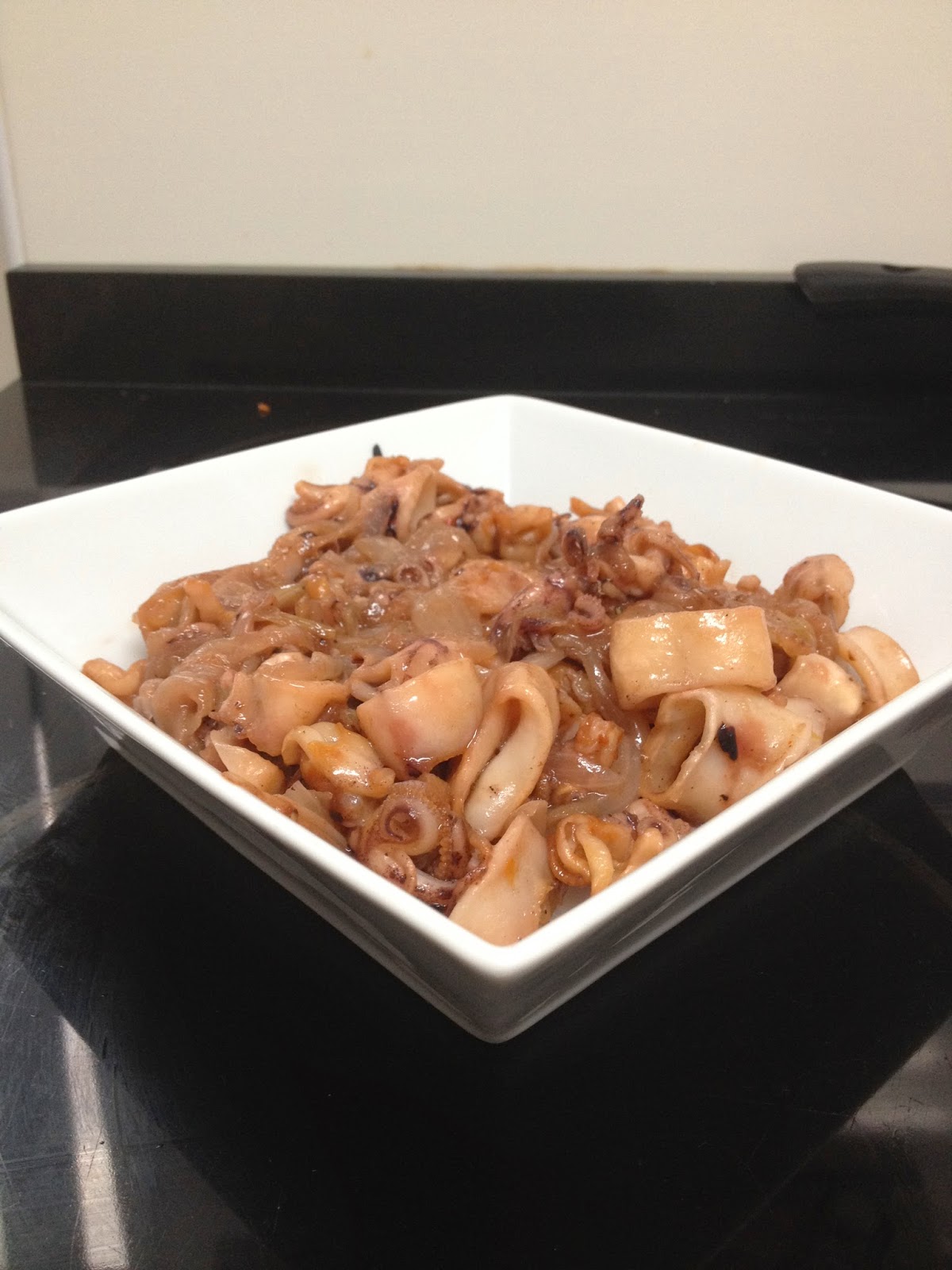 En un cazuela pochamos la cebolla cortada en juliana, una vez esté en el punto deseado, incorporamos los chipirones y los rehogamos todo junto, añadimos el vino blanco, dejamos que reduzca y que evapore el alcohol.