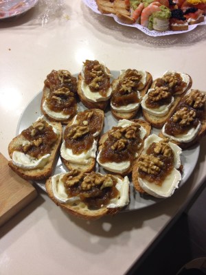 Montar la tosta con el queso de cabra en rodajas (mejor que el queso este un poco caliente), ponemos un poco de cebolla y decoramos con un trozo de nuez.
