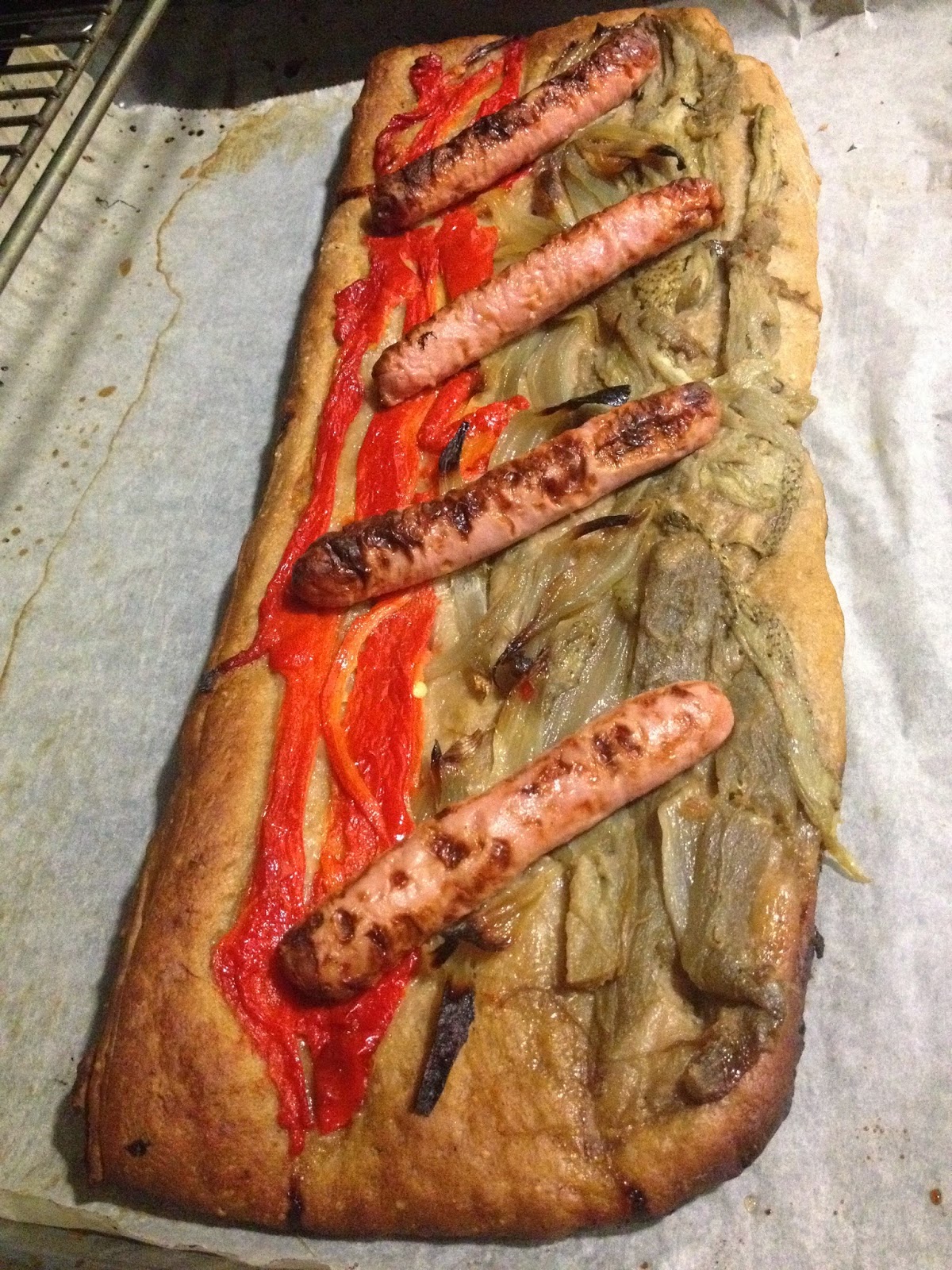 Después de ese tiempo estiramos la masa en forma rectangular que quede fina, colocamos la verdura asada en tiras por encima, ponemos las butifarras encima.