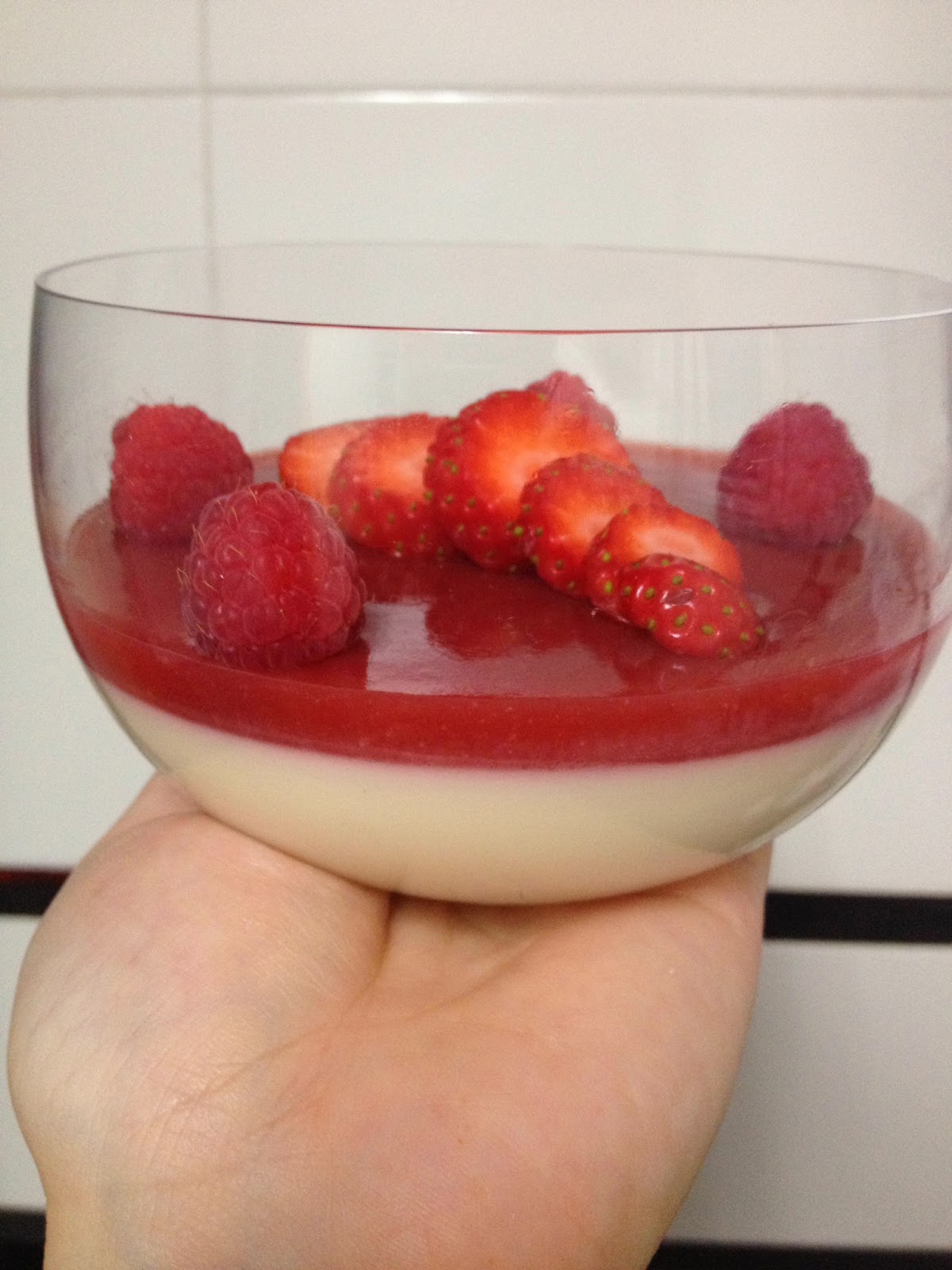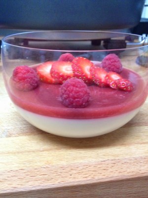 Dejamos enfriar un poco y lo vertemos en los recipientes encima de la Panacota y colocamos en la nevera para que cuaje todo.
