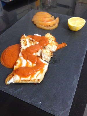 Calentamos la salsa y lo vertemos por encima del bacalao.
