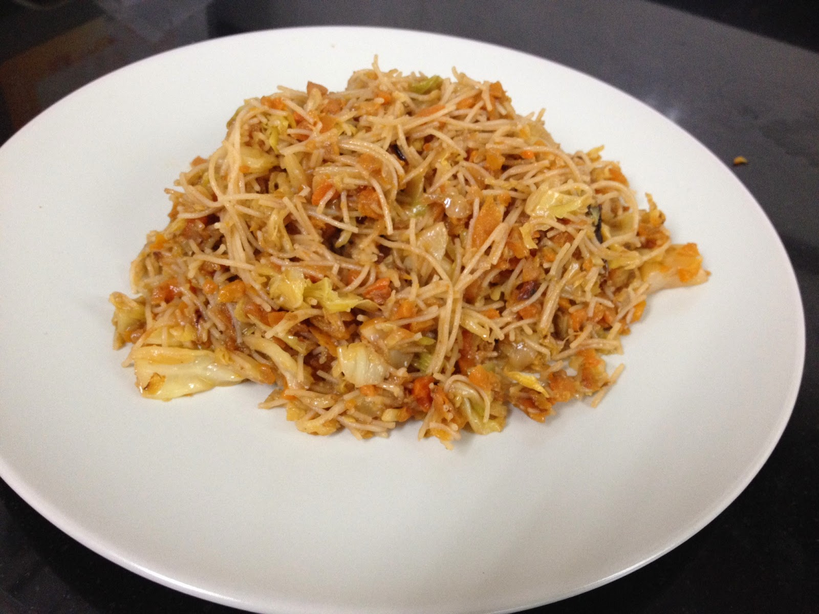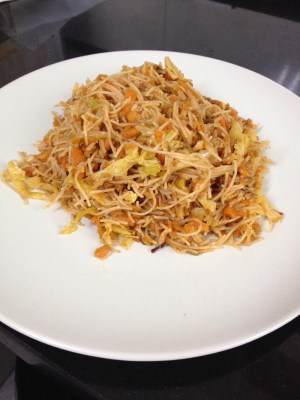 En una cazuela con agua y aceite hervimos los fideos de arroz durante 4 minutos, los escurrimos e incorporamos a las verduras, lo mezclamos todo junto y rectificamos de soja hasta tener lo a nuestro gusto.