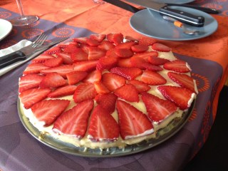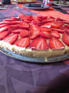 Sacamos el molde del congelador o frigorífico y vertemos la mezcla por encima de las galletas, dejamos enfriar durante 6-8 horas en el frigorífica hasta que cuaje.Una vez este bastante cuajado, lo decoramos por encima con las fresas lavadas y cortadas en laminas.