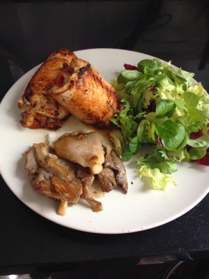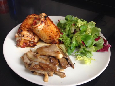 Emplatamos, acompañamos a los rollotos con las setas y un poco de lechuga variada aderezada con sal, aceite y vinagre.