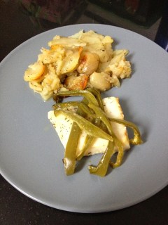 En otra fuente colocamos los trozos de bacalao desalados, al rededor colocamos el pimiento verde cortado en juliana y añadimos el vino blanco. Rectificamos de sal y pimienta.