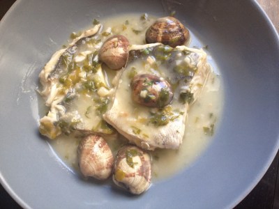 En una cazuela sofreímos el ajo picado muy pequeño, cuando empiece a coger color, añadimos la cucharada de harina, la rehogamos con el aceite y el ajo para que se cocine, utilizamos unas varillas de batir para deshacer los grumos, vamos añadiendo el vino blanco y vamos mezclando para que se vaya homogeneizando la salsa. Cuando ya tengamos todo el vino incorporado, meneamos la cazuela y añadimos los trozos de merluza con la piel hacia arriba. Posteriormente añadimos el vaso de caldo de pescado y movemos la cazuela.Añadimos el perejil picado y las almejas. Volvemos a menear la cazuela en círculos