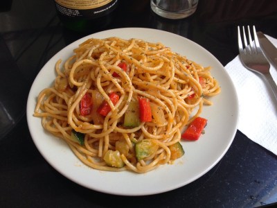Una vez cocidos, los escurrimos e incorporamos a las verduras, lo salteamos todo junto y emplatamos.