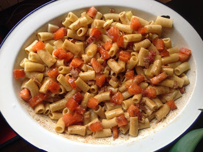 Colocamos los macarrones en una bandeja y vamos incorporando los tacos de jamón, la piña, las nueces y el bonito. mezclamos todo.