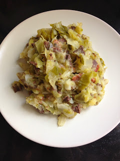 Una vez cocida las patatas y el repollo, lo escurrimos, retiramos la butifarra negra y chafamos la verdura junto con las patatas.