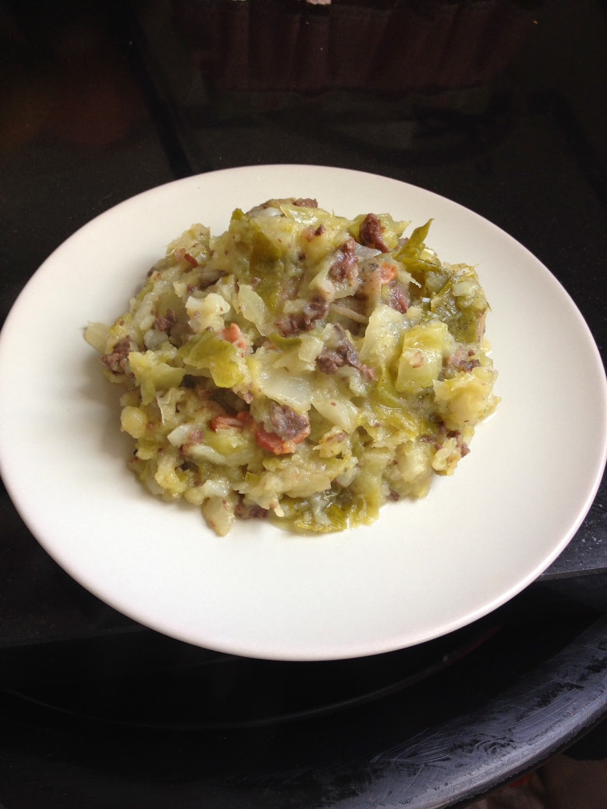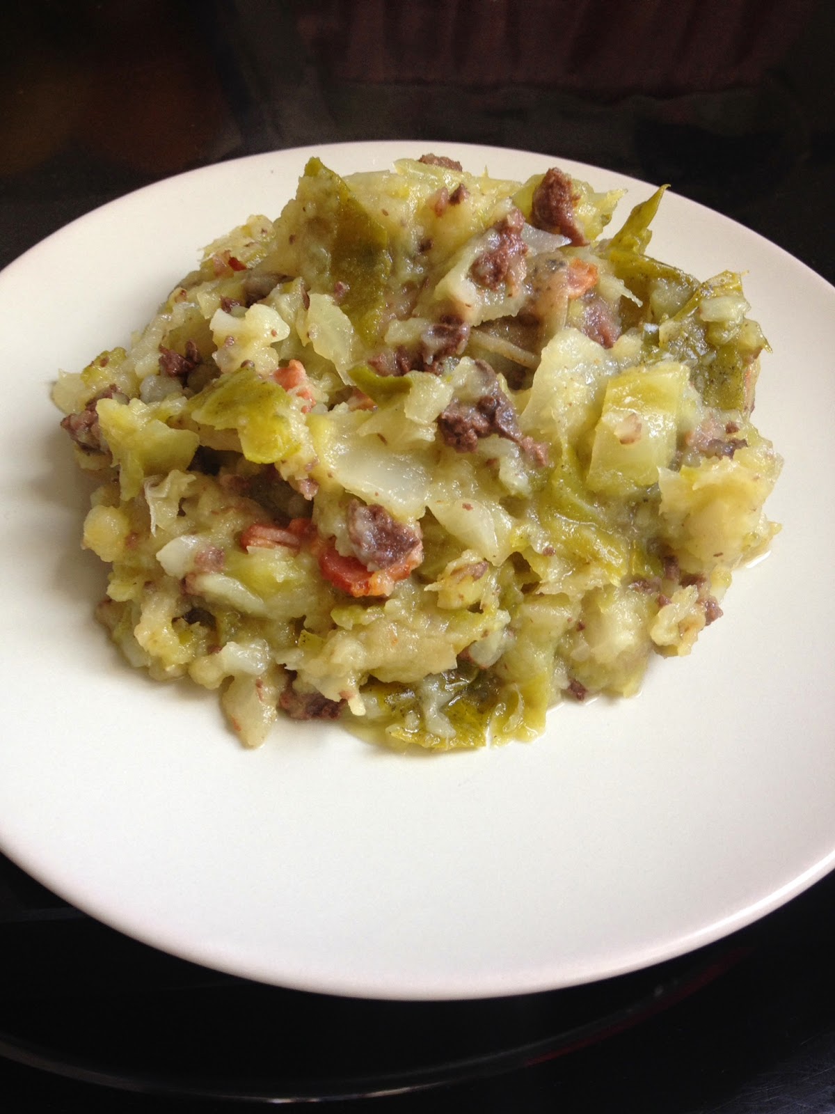 Una vez cocida las patatas y el repollo, lo escurrimos, retiramos la butifarra negra y chafamos la verdura junto con las patatas.
