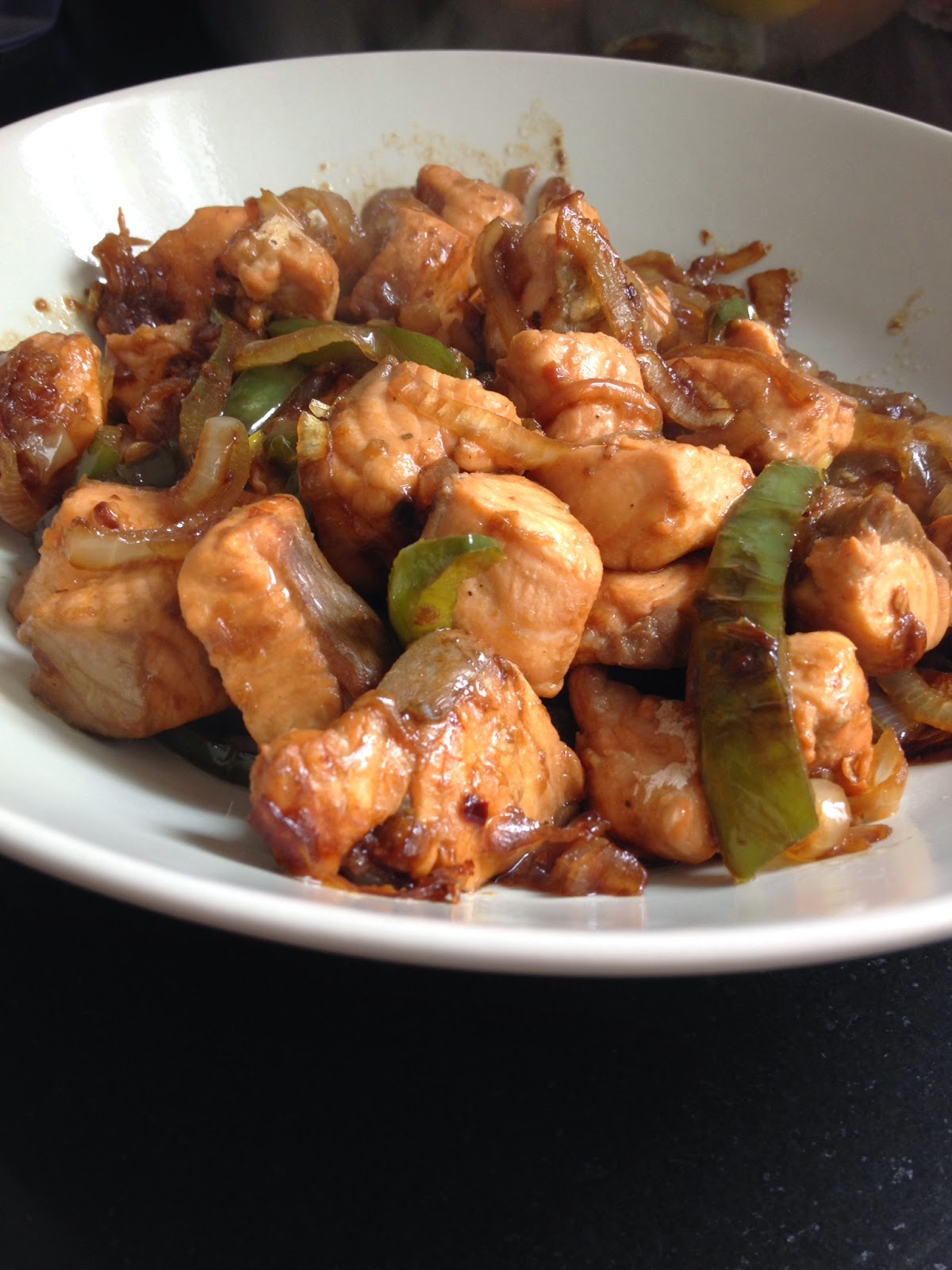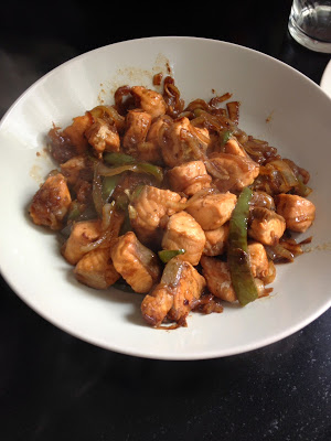 En una sartén con un poco de aceite al fuego, incorporamos la cebolla y el ajo, dejamos pochar y cuando empiece a blanquear la cebolla añadimos el pimiento en tiras, lo rehogamos, cuando está casi cocinado en el último momento incorporamos los dados de salmón previamente sazonados, salteamos todo junto e incorporamos la salsa de soja, un chorro pequeño, ya sabéis que es muy salada y debéis controlar.