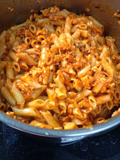 Una vez esté listo el sofrito, lo vertemos por encima de los macarrones y removemos para que la pasta se impregne de la salsa.