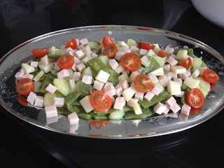 Vamos colocando por encima el resto de los ingredientes, los dados de pavo, los dados de queso y los tomates cherry.