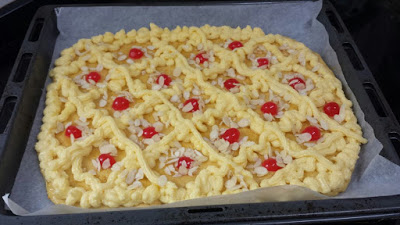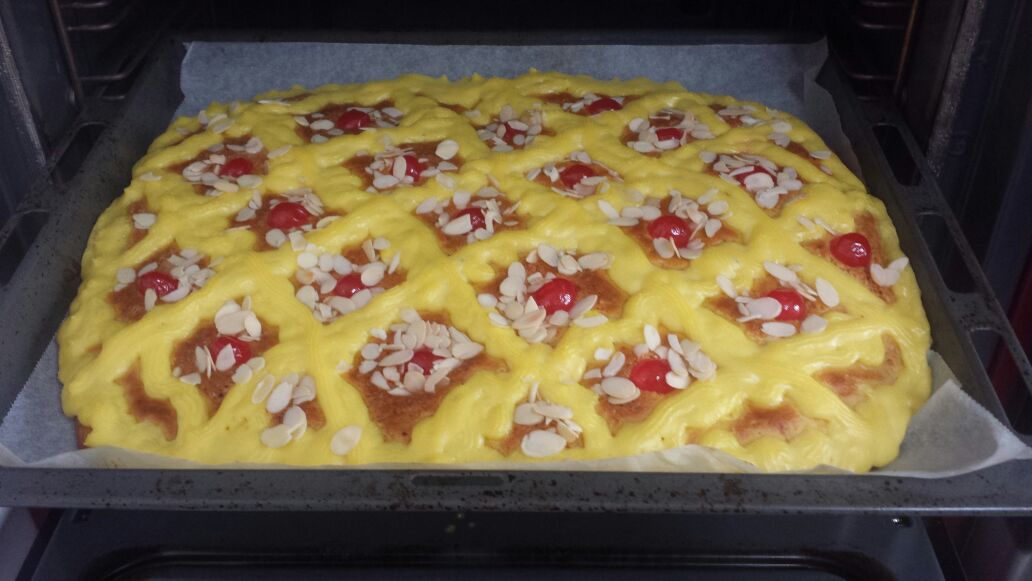 Metemos la crema pastelera en una manga y hacemos en enrejado sobre la masa.