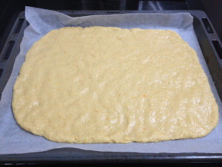 Nos untamos las manos con un poco de aceite para poder manejar la masa. La sacamos del vaso y la extendemos sobre el papel vegetal. Tiene que quedar bien extendida por toda la base y del mismo grosor. Pincelamos la masa con huevo batido.
