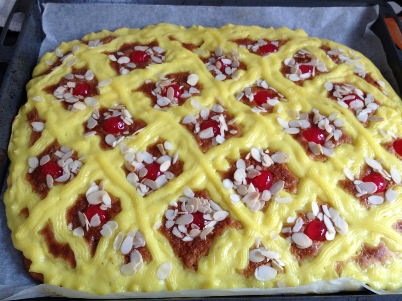 Decoramos con las guindas bien escurridas. Echamos almendras laminadas por encima y dejamos que repose durante 20 minutos, a temperatura ambiente y en un lugar sin corrientes.