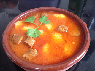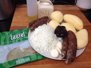 En la misma cazuela incorporamos el litro y medio de agua, las hojas de laurel y la masa obtenida de la batidora, lo disolvemos bien e incorporamos las patatas y los chorizos cortados en rodajas del tamaño del dedo pulgar. Rectificamos de sal.