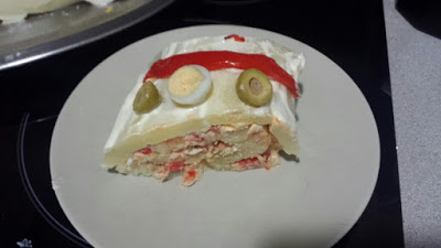 Lo extendemos en un papel film o de horno y dejamos enfriar. Encima vertemos el relleno y vamos enrollando con la ayuda del papel o el plástico y vamos dando forma de brazo de gitano. Lo hacemos con mucho cuidado. Cuando esta listo lo pintamos con mayonesa y decoramos con los huevos de codorniz y el pimiento asado.