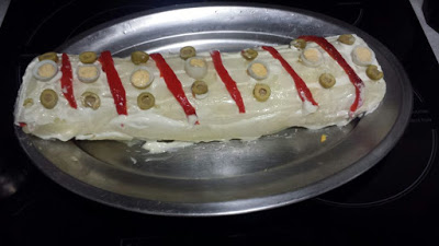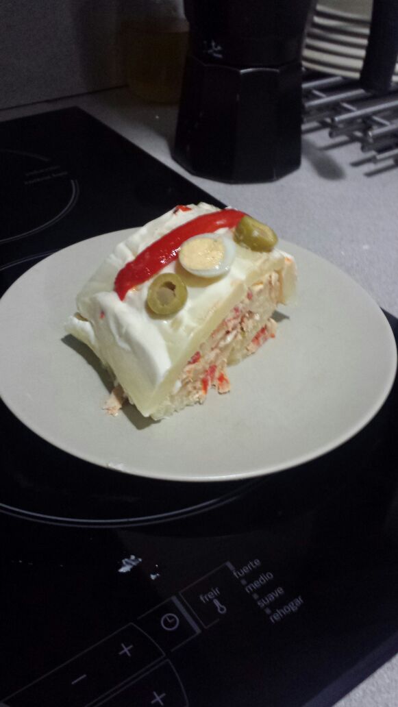 Por otro lado en un bol desmigamos el bonito escurrido, incorporamos las aceitunas, el pimiento y los huevos cocidos picados y lo mezclamos todo junto. Añadimos un poquito de mayonesa para que quede el relleno homogéneo. Reservamos.