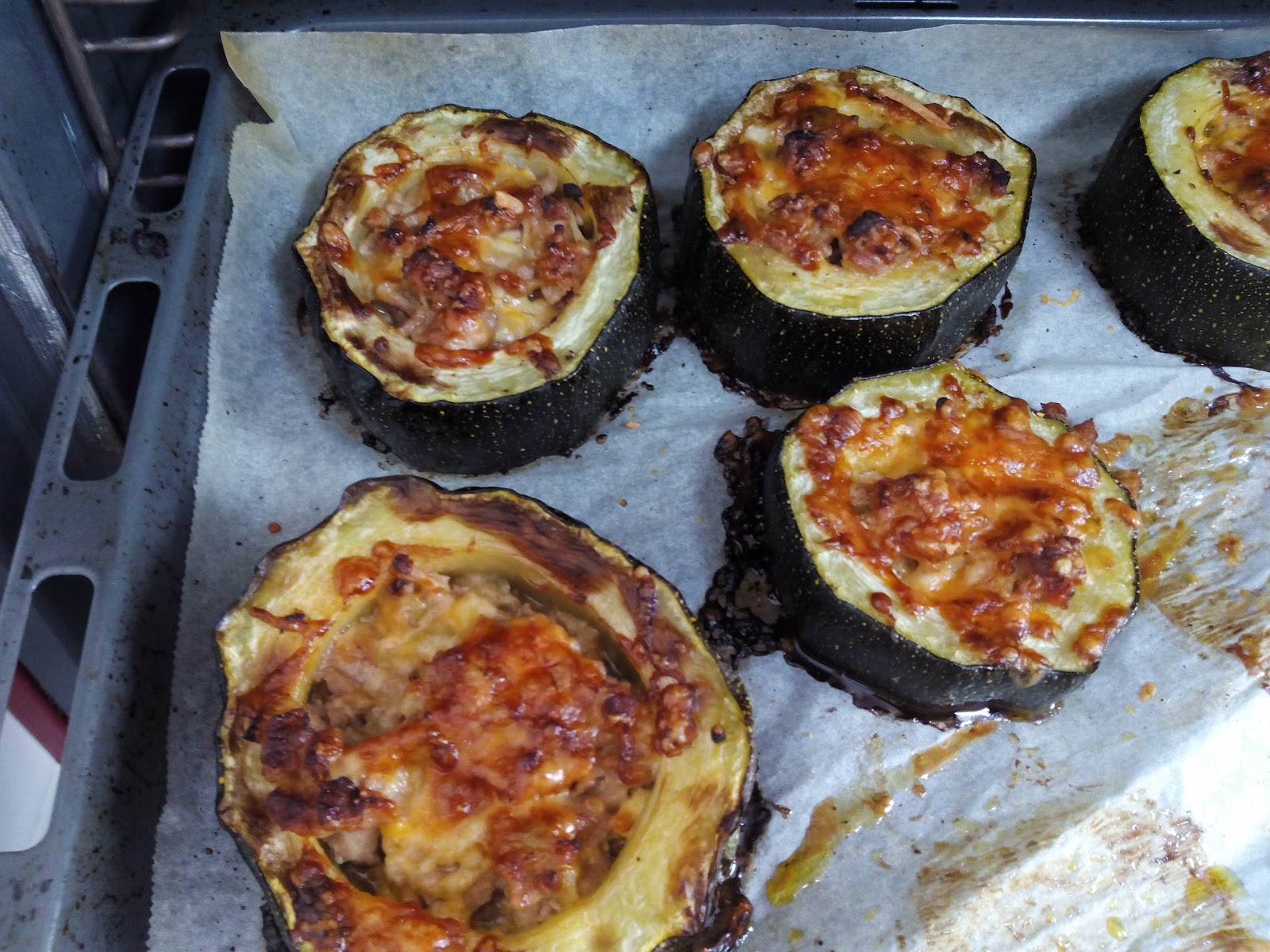 Una vez estén los calabacines casi cocidos del horno y trascurridos los 30 minutos, los rellenamos con el relleno, espolvoreamos con el queso rallado y acabamos de cocinar en el horno con el gratinador durante 10-15 minutos a 215º.