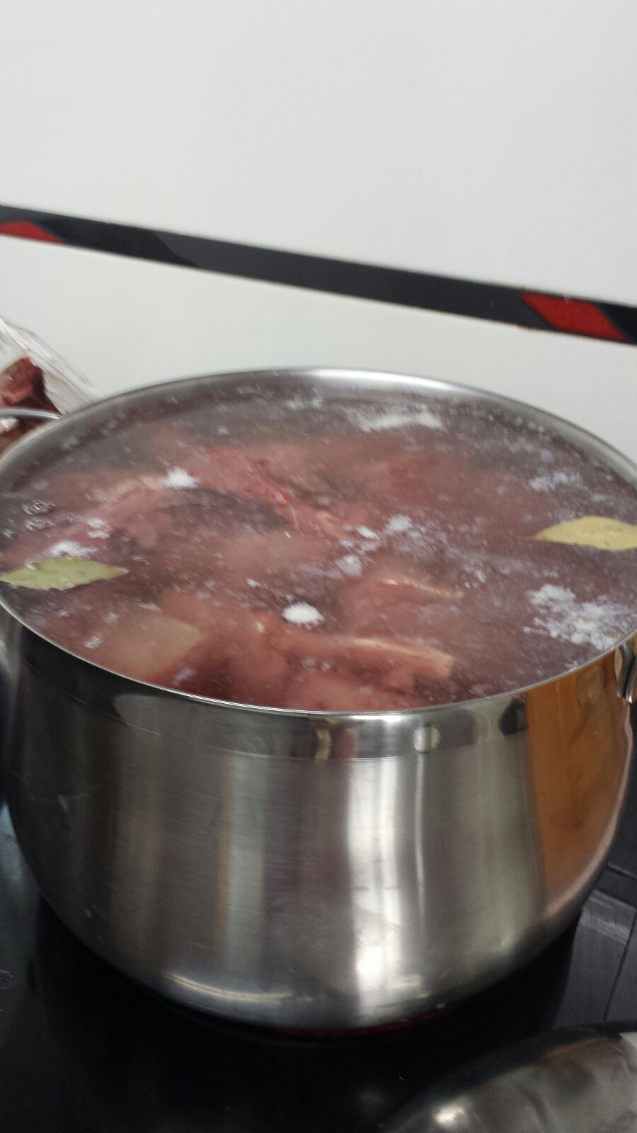 Una vez limpio lo ponemos a hervir en una olla grande con agua, la sal marina gruesa y las dos hojas de laurel.
