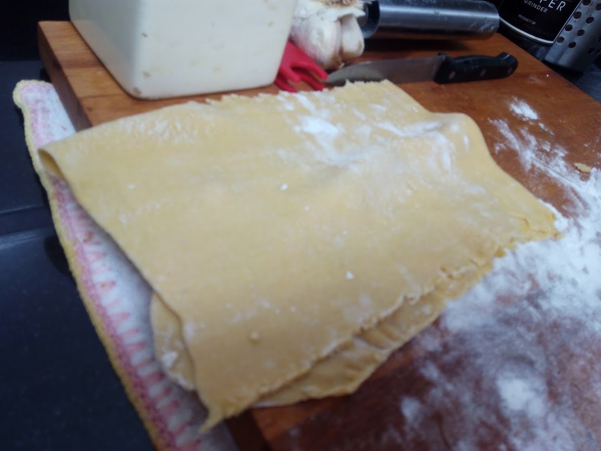 Cuando haya pasado el tiempo, sacamos de la nevera, la cortamos en dos, la aplastamos con la mano y con una maquina especial para pasta la vamos estirando.