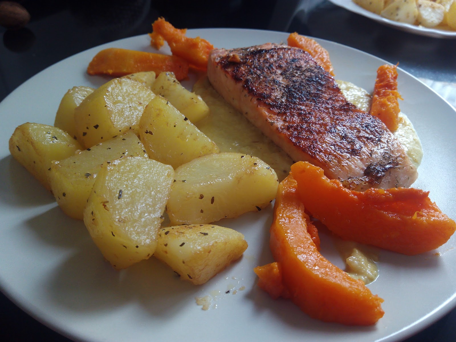 En una sartén con la mantequilla salteamos las patatas y la calabaza.
