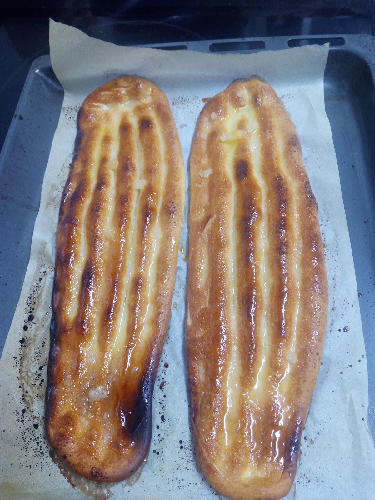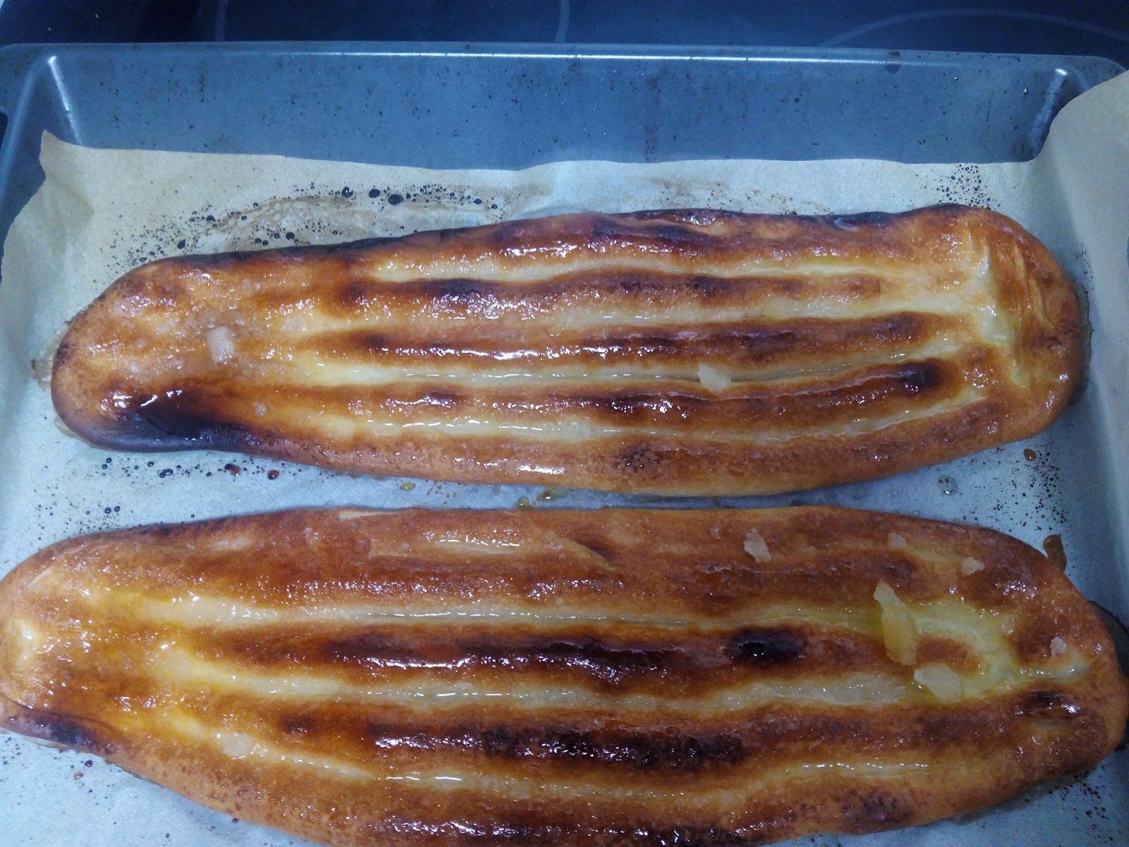 Colocamos papel de horno en una bandeja, colocamos la masa y le damos forma alargada, la aplanamos, dejamos reposar dentro del horno apagado durante 20 min.