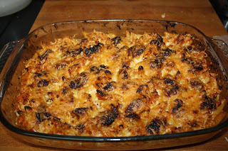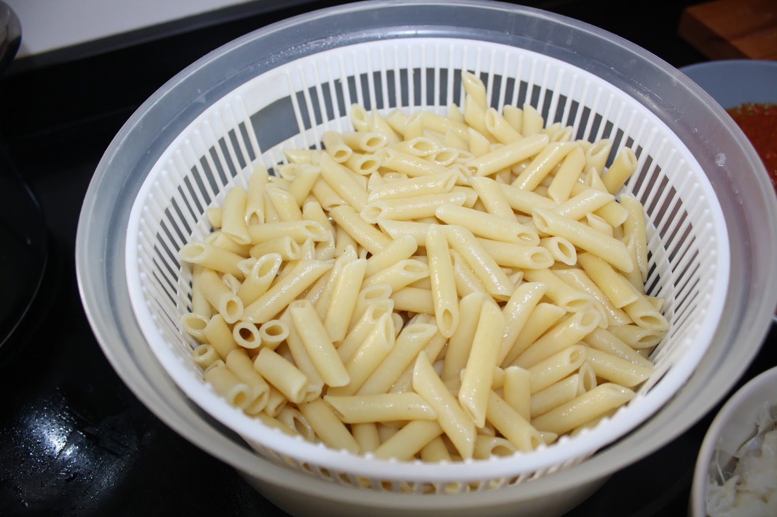 A continuación colocamos el alioli por encima de los macarrones y el queso rallado.