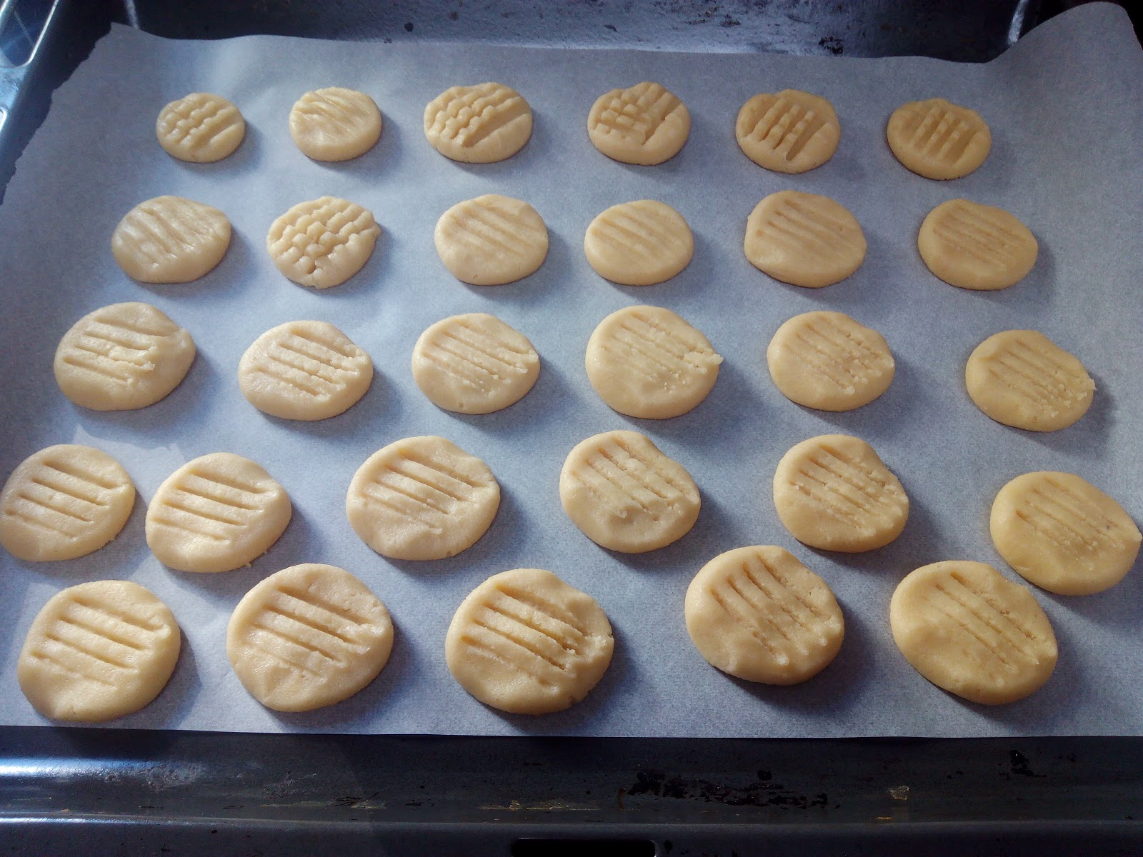 En una bandeja de horno ponemos papel vegetal, vamos formando bolas del tamaño de una nuez y las vamos poniendo en la bandeja separadas unas de otras, cuando hayamos terminado de hacer las bolas, las chafamos con los dedos sin que se queden muy finas y les hacemos una marca con un tenedor.