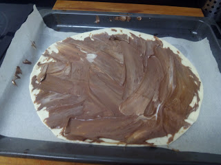 Extendemos la nocilla por encima y la repartimos por toda la superficie de la masa, hay que dejar el borde libre para poder cerrar la masa y que no sobre salga la nocilla.