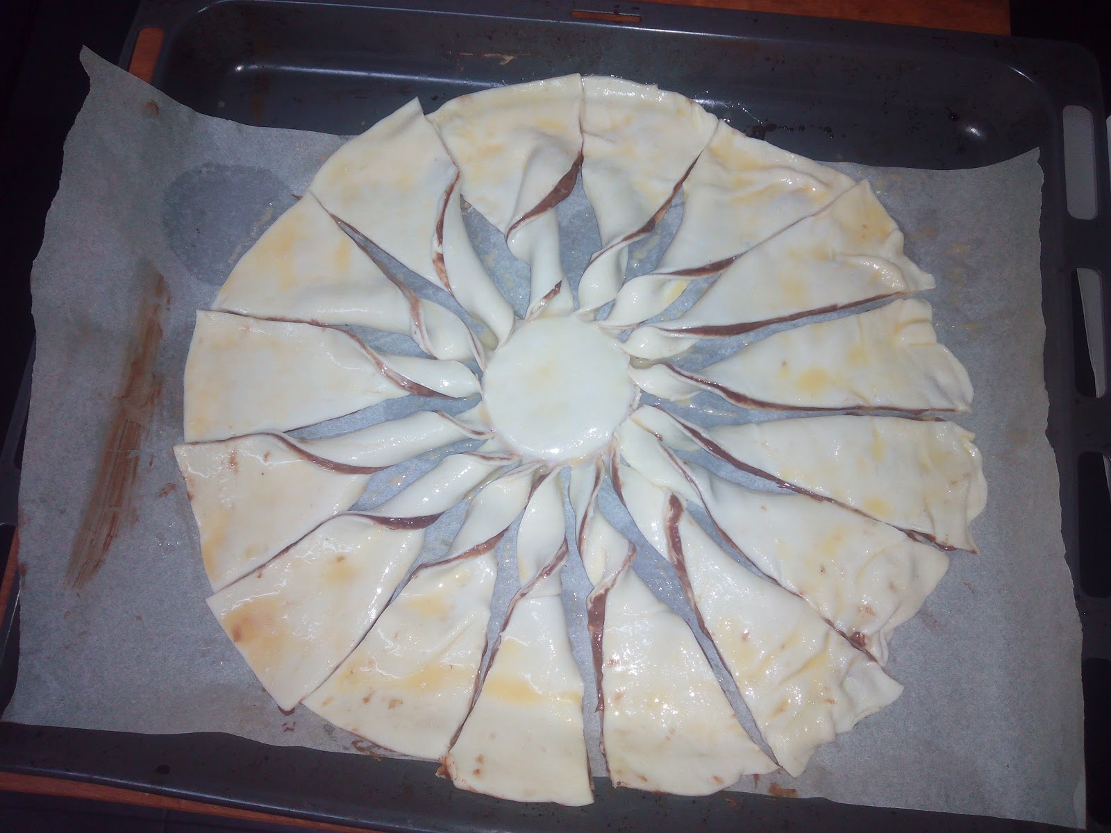 Extendemos la nocilla por encima y la repartimos por toda la superficie de la masa, hay que dejar el borde libre para poder cerrar la masa y que no sobre salga la nocilla.
