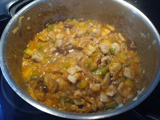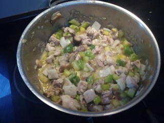 Añadimos el pollo troceado, salteamos, incorporamos el tomate y el vino blanco, removemos, dejamos evaporar el alcohol.