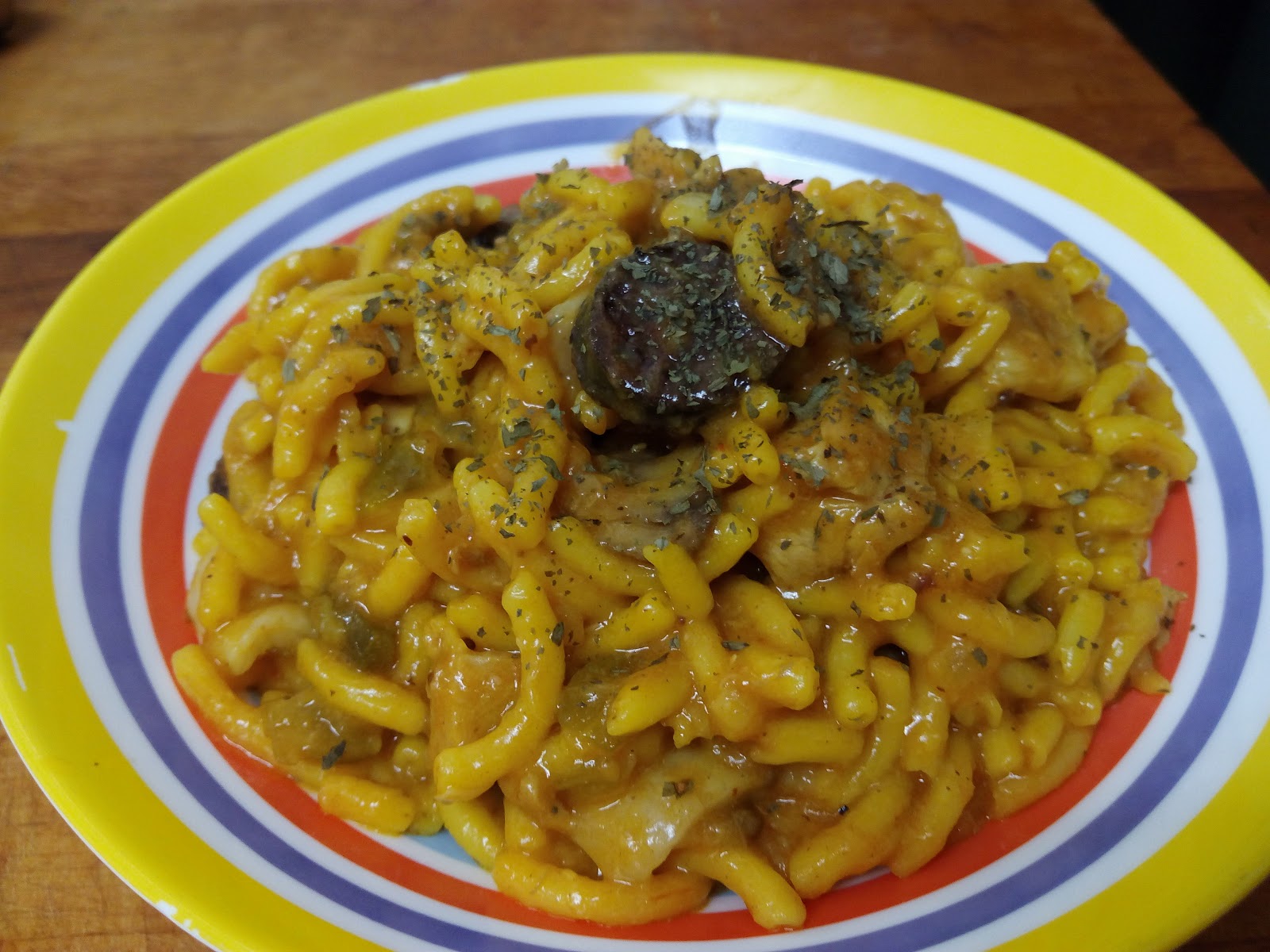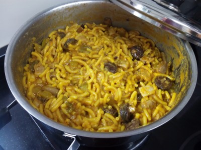 Pasados 10 minutos incorporamos los fideos, removemos, incorporamos el caldo de pollo, colorante, sazonamos y dejamos cocer 10-12 minutos.