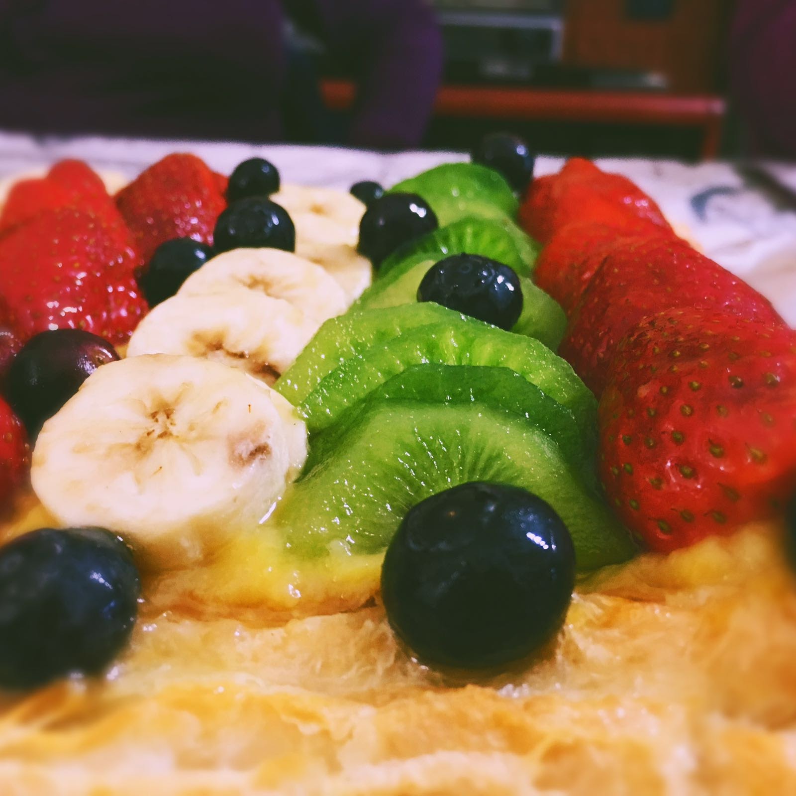 Una vez esté todo frío, vertemos la crema pastelera por encima del hojaldre, alisamos con una lengua y colocamos la fruta en forma de cascada. Los arándanos los colocamos por encíma.