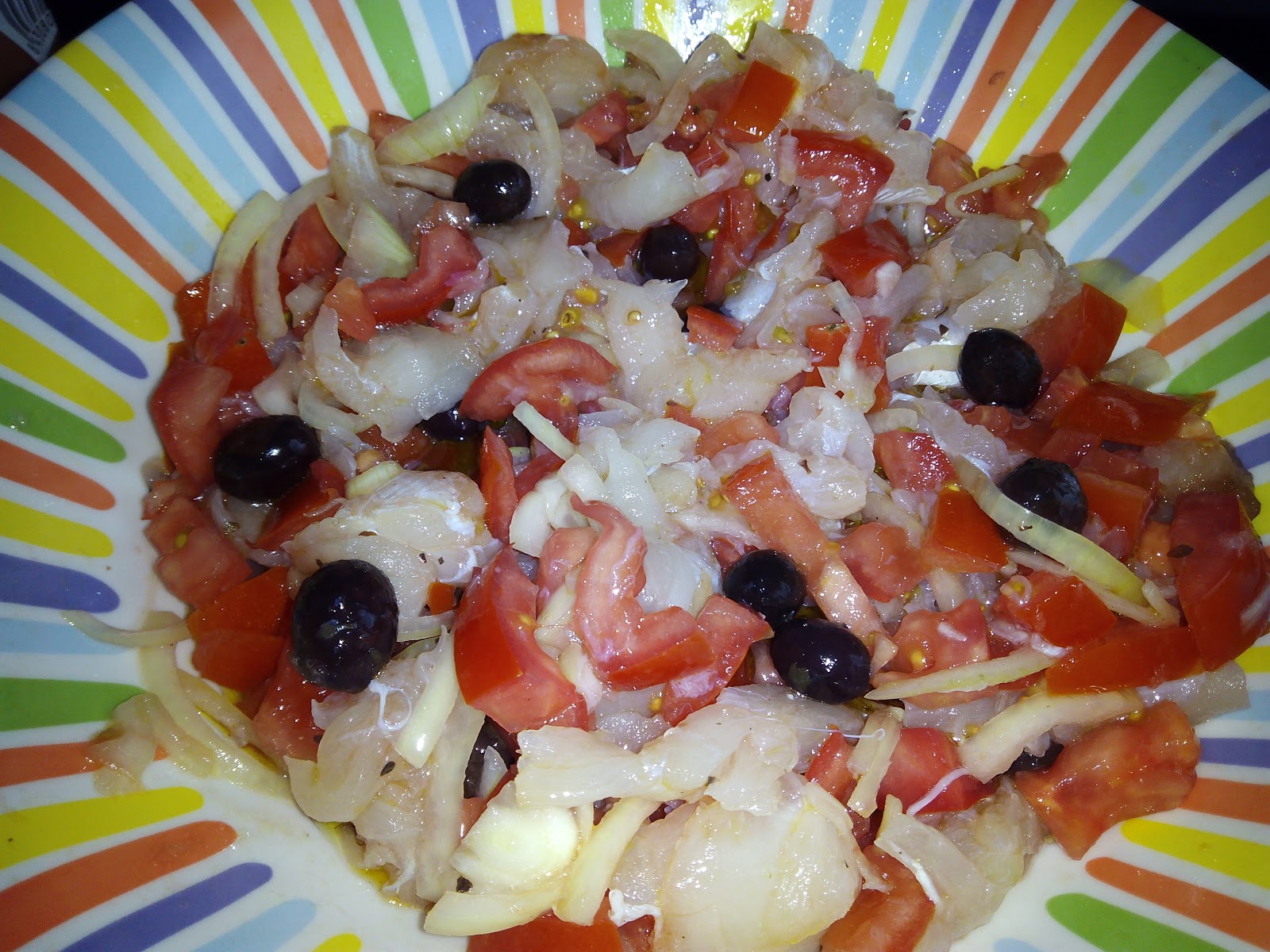 Desmigamos el bacalao, lo mezclamos todo junto en la fuente y salamos.