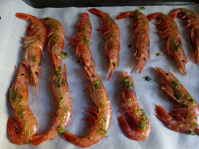 Colocamos lo langostinos en la bandeja, salamos.