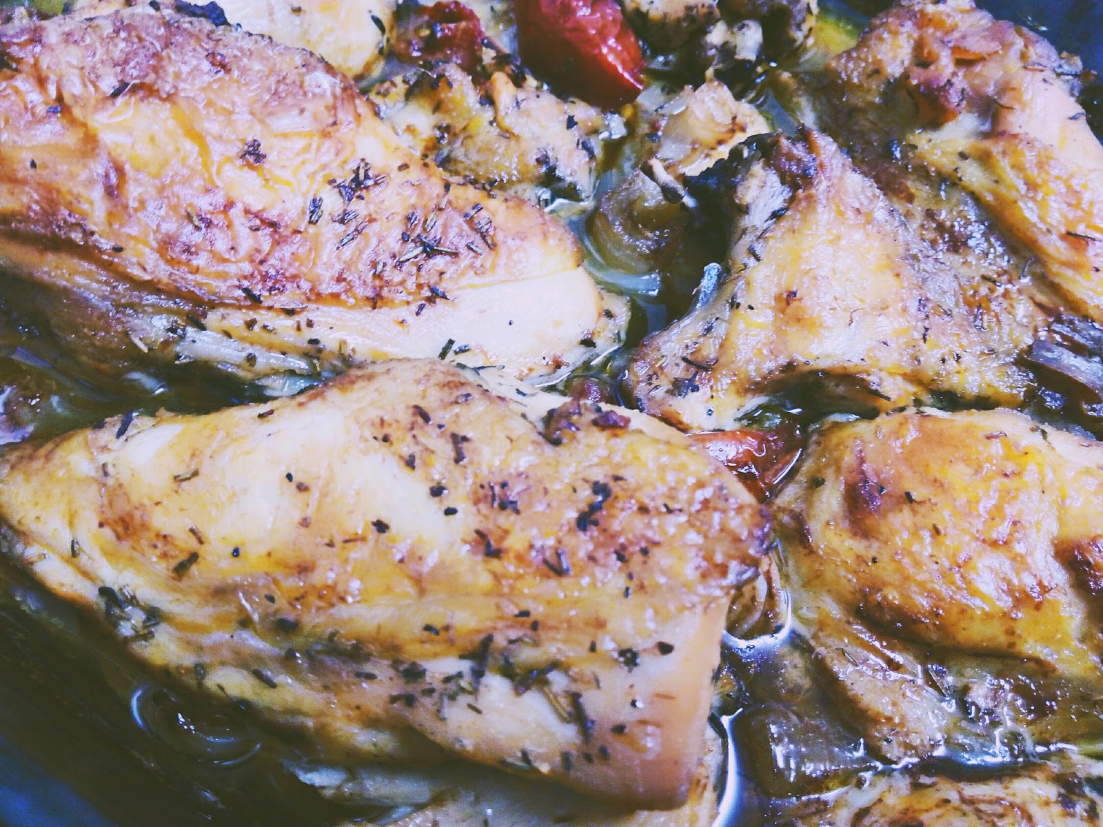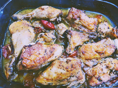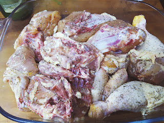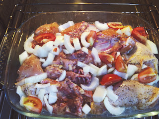 El día que tengamos que cocinar el pollo, lo colocamos en una bandeja de horno, tras estar marinado previamente, añadimos las cebollas cortadas en cuartos o en trozos no muy grandes y los tomates también.