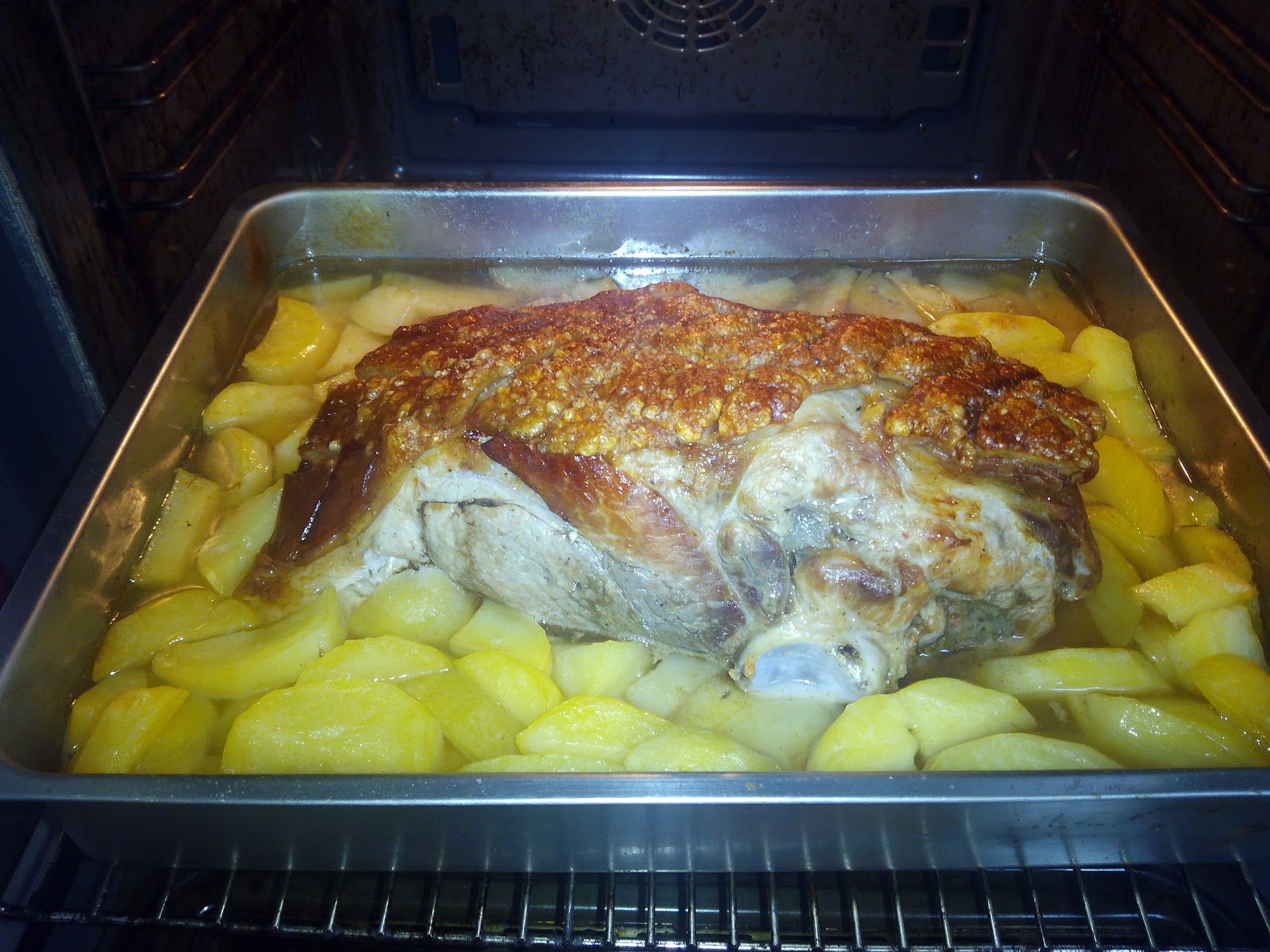 Cuando queden unos 40 minútos para finalizar el tiempo del horno, las colocamos al rededor de la paleta de cerdo, las salamos.
