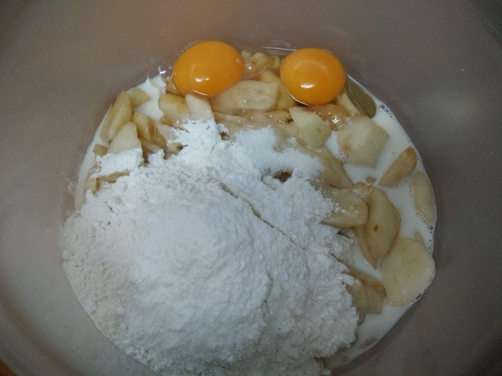 En una vaso medidor o vol, vertemos los dos huevos, la harina junto con la levadura, las peras troceada, el azúcar, esencia de vainilla y el vaso de leche.