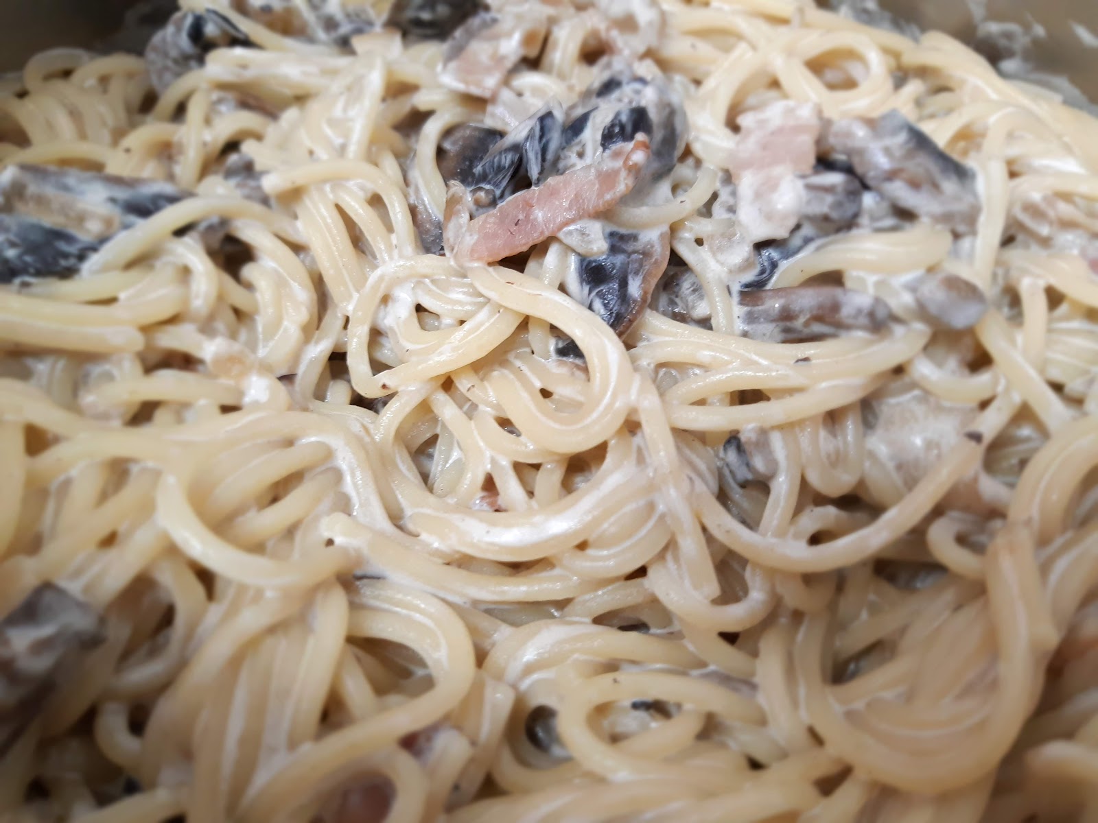 Cogemos una sartén con un chorro de aceite, vertemos la cebolla y pochamos, en el momento que esté medio pochada la cebolla, incorporamos los champiñones laminados, sazonamos, los salteamos junto a la cebolla. Incorporamos el bacon y salteamos. Por último vertemos la nata líquida y cocemos hasta que espese.