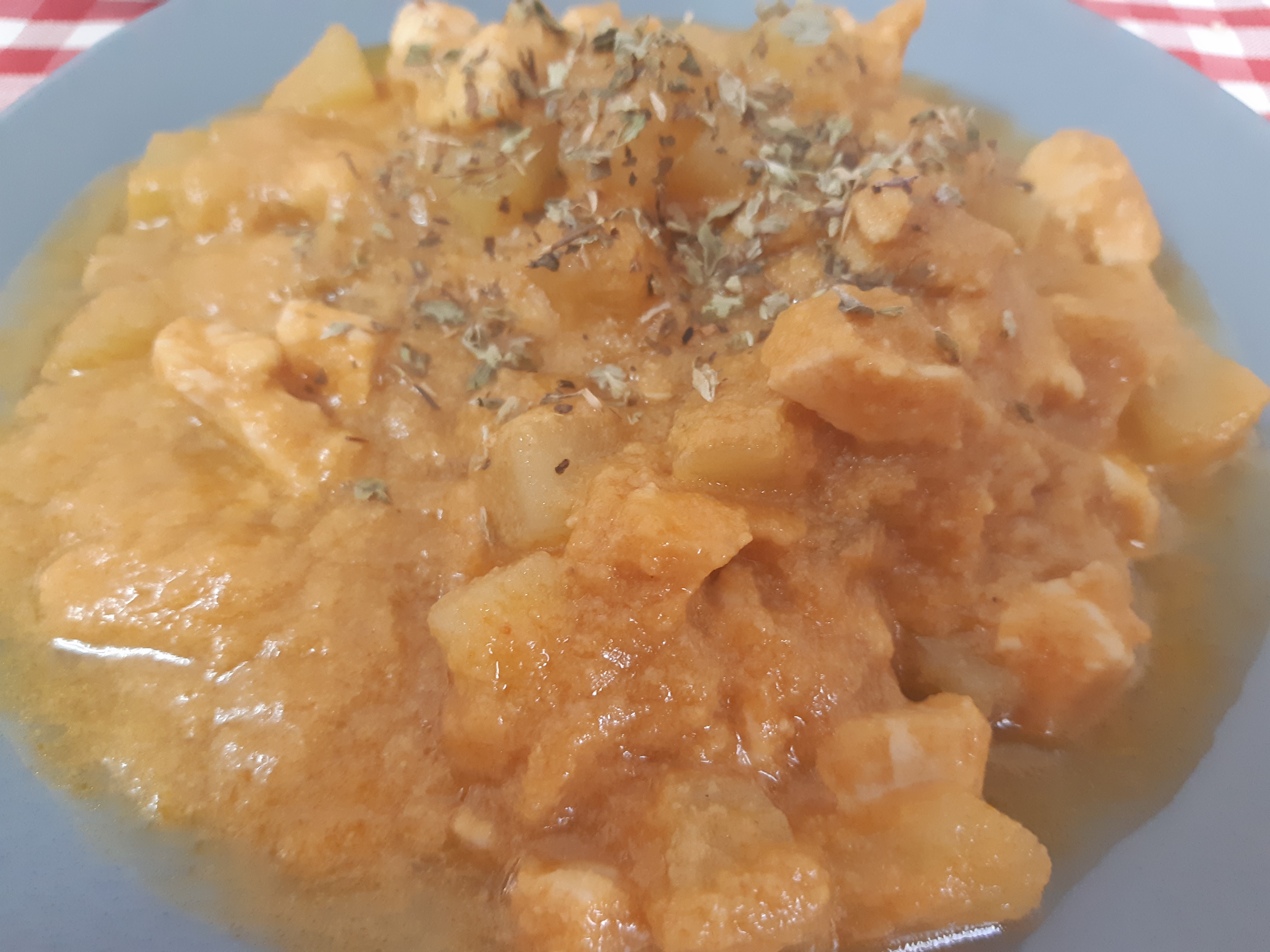 Cubrimos con agua o caldo de verduras y cocemos hasta que las patatas y el pollo estén cocinadas.