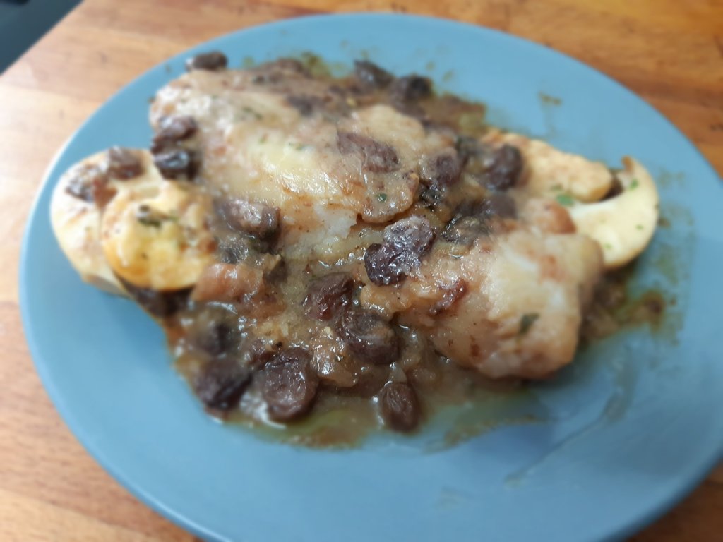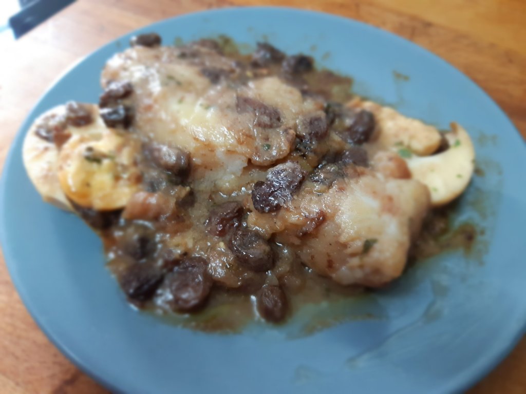 Vertes esta salsa en la cazuela encima del bacalao, ponemos las pasas por encima y el huevo duro cortado en rodajas, movemos un poco la cazuela y la llevamos al horno hasta que la salsa se haya consumido un poco.